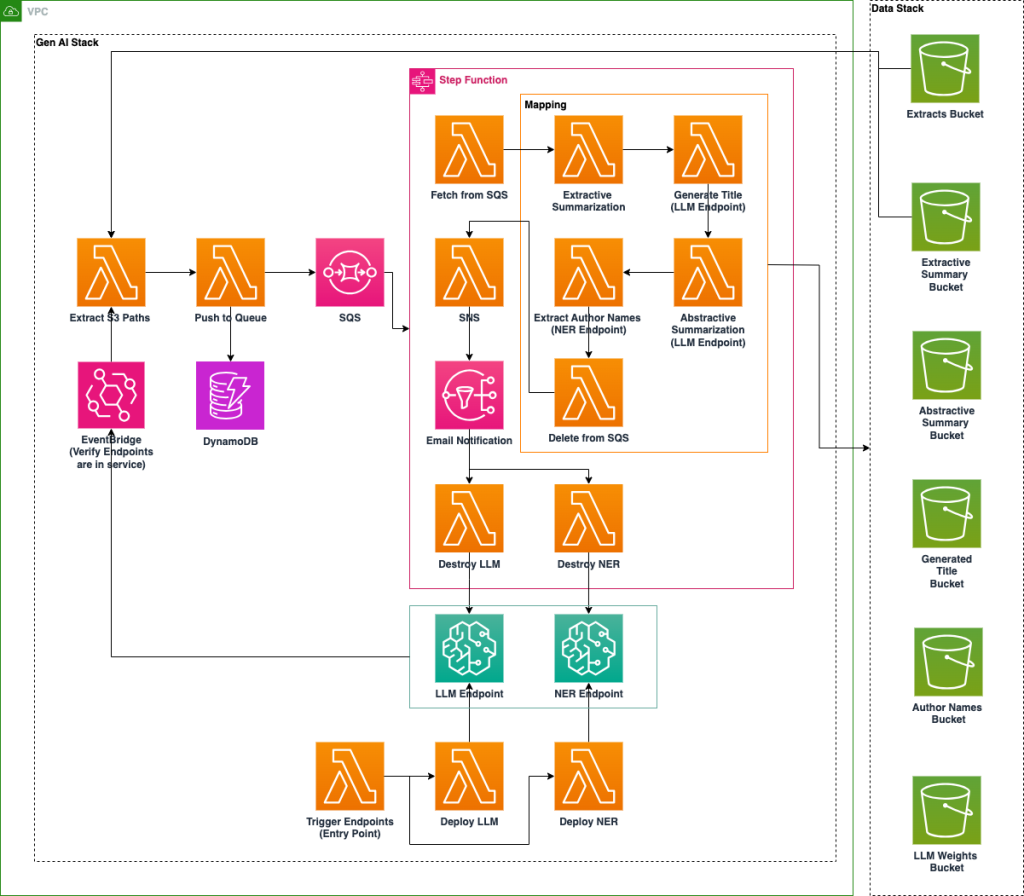 The architecture implements a serverless design with dynamically managed SageMaker endpoints that are created on demand and destroyed after use, optimizing performance and cost-efficiency. The application follows a modular structure with distinct components handling different aspects of document processing, including extractive summarization, abstractive summarization, title generation, and author extraction. These modular pieces can be removed, replaced, duplicated, and patterned against for optimal reusability.