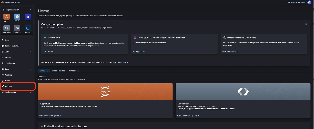 When you’re in SageMaker Studio, you can access SageMaker JumpStart by choosing JumpStart in the navigation pane.