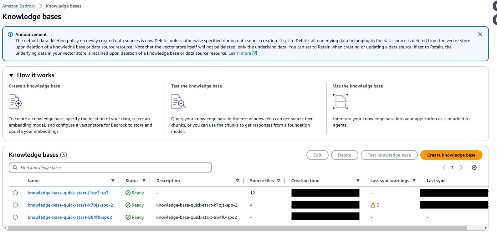Retain – Retains all underlying data in your vector store upon deletion of a knowledge base or data source resource.