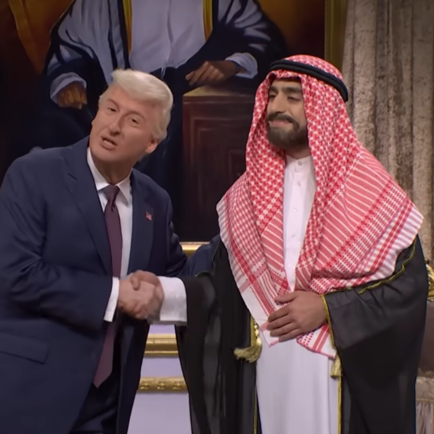This weekend’s broadcast, hosted by Scarlett Johansson and featuring the musical guest Bad Bunny, began with a sendup of President Trump’s recent visit to Saudi Arabia and Qatar.
