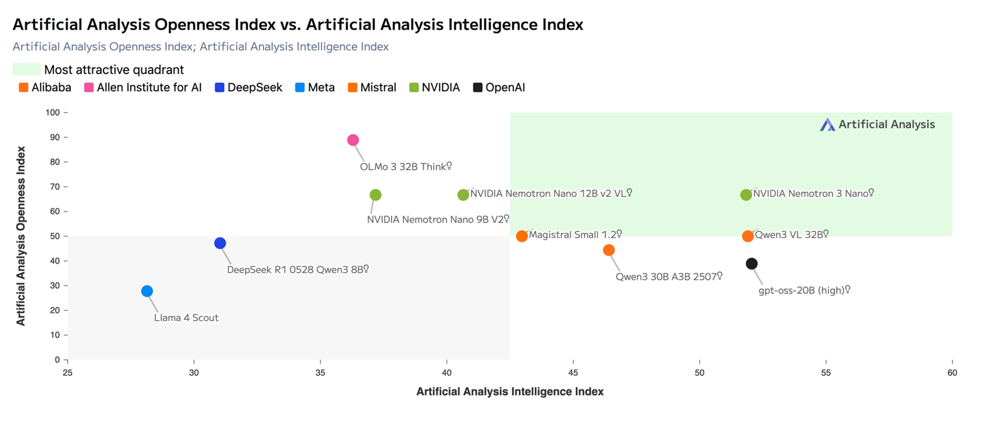 Title: Chart showing Nemotron 3 Nano in the most attractive quadrant in Artificial Analysis Openness vs Intelligence Index (Source: Artificial Analysis)